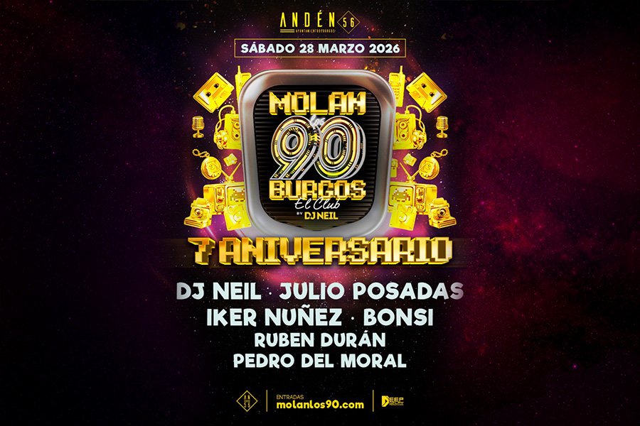 ¡Celebra el 7º aniversario de Molan los 90 en la Sala Andén 56! El próximo 28 de marzo vive un viaje a la década de los 90 con himnos que marcaron una época. Participan Neil Sole, Julio Posadas, Iker Núñez, Bonsi DJ, Rubén Durán y Pedro del Moral.